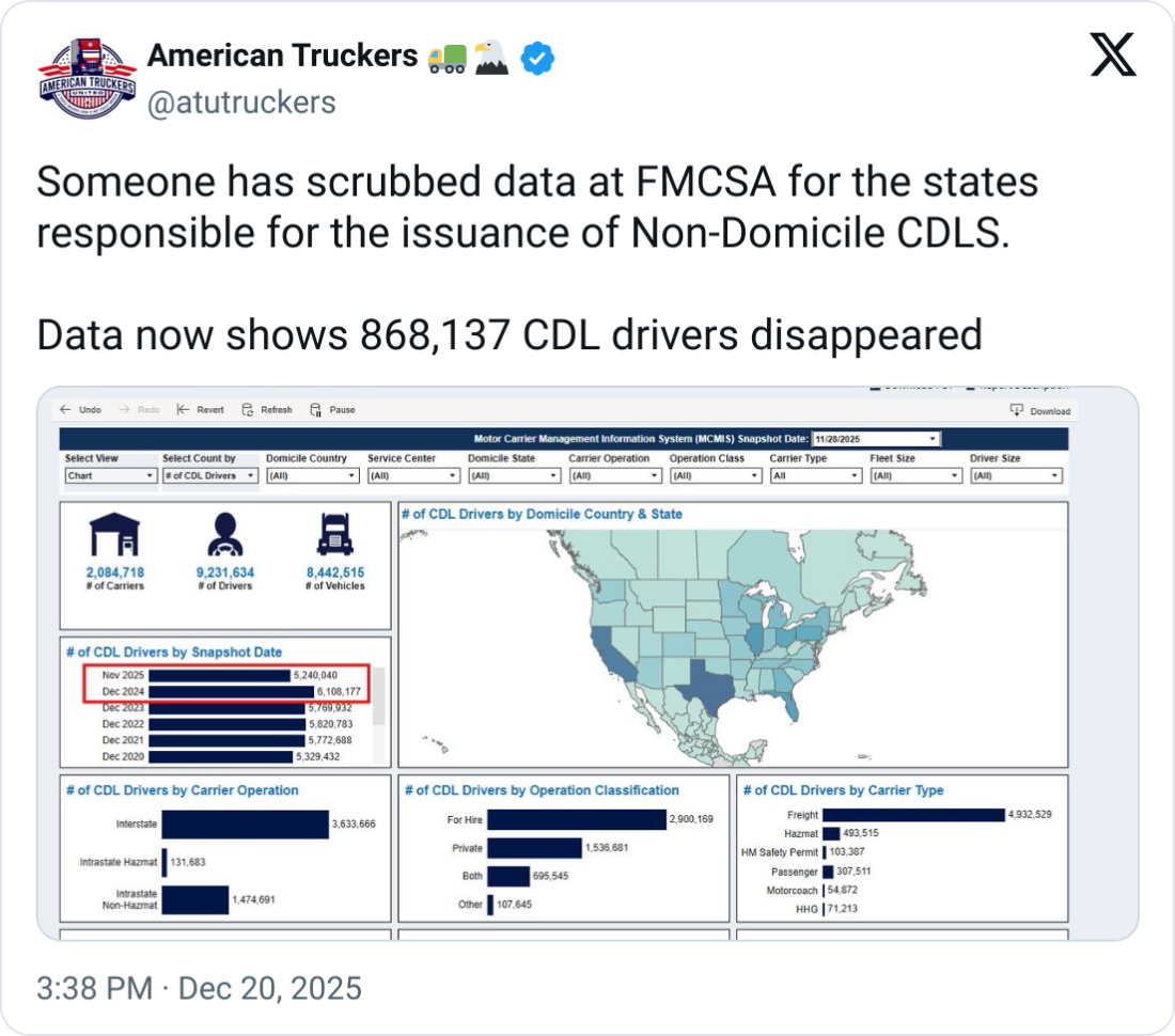 Separately, a discussion has been circulating on Freight X alleging that data tied to non-domiciled CDLs was āscrubbedā from federal dashboards. Those claims have not been confirmed by FreightCaviar.