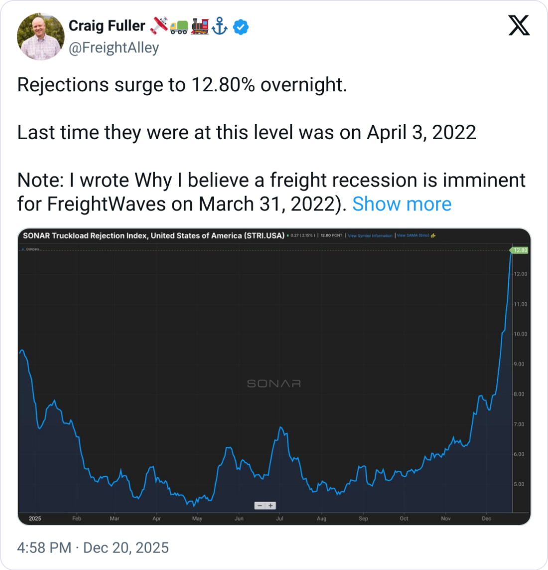 š Rejections Spike Again. Truckload rejection rates jumped to 12.8% overnight, their highest level since April 2022, according to SONAR data shared by Craig Fuller.