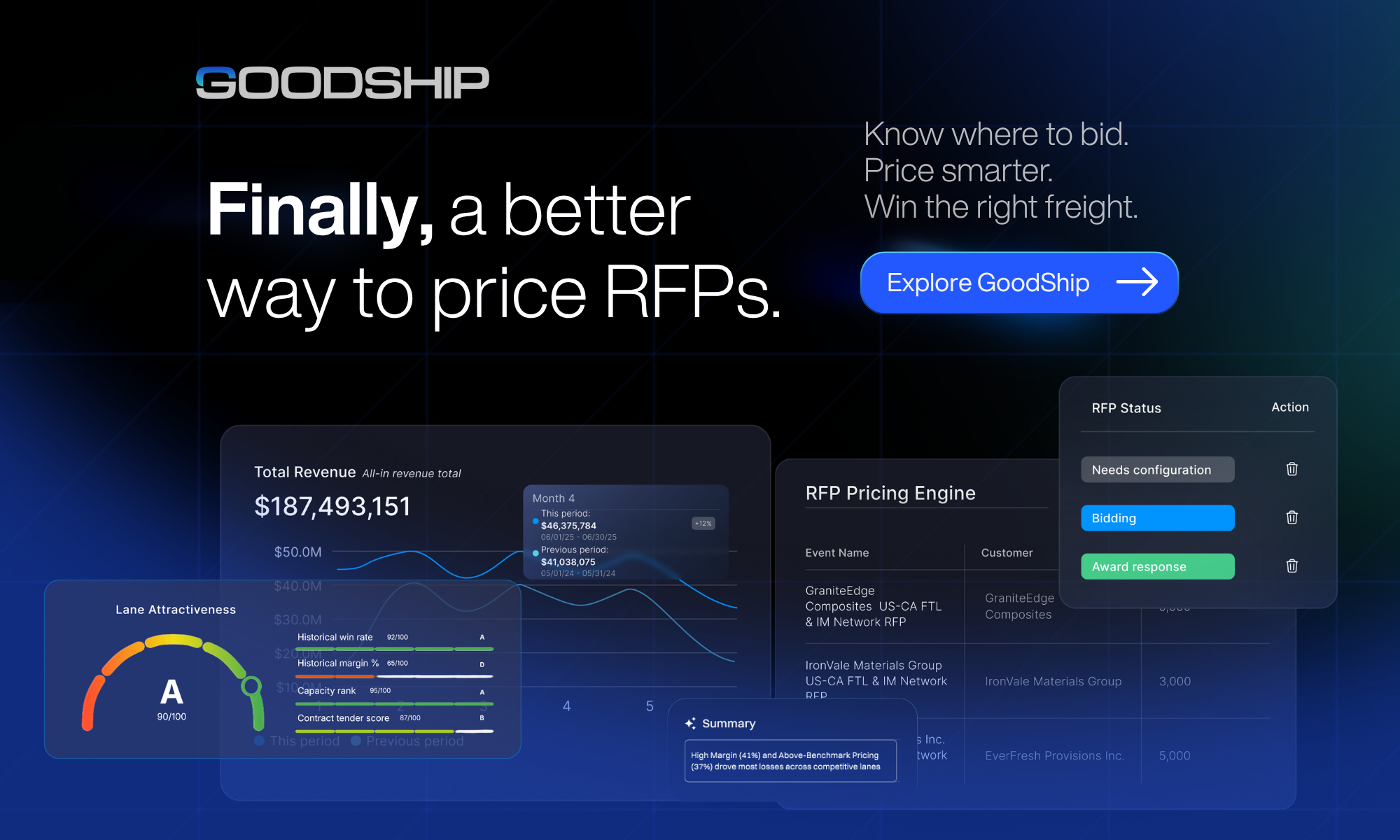 GoodShip brings together pricing, bid history, contract management, and analytics into a single system, giving teams the ability to evaluate opportunities, align around the right lanes, and orchestrate pricing decisions across their network with confidence.