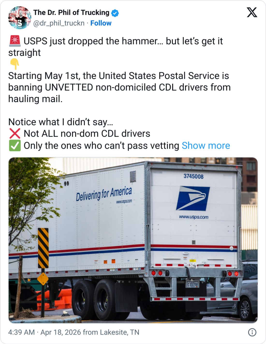 🚨 USPS Sets May 1 Deadline. Starting May 1, the Postal Service will ban unvetted non-domiciled CDL drivers from transporting mail, one of the largest single-employer enforcement actions to follow the FMCSA's final rule. USPS moves roughly 40% of U.S. mail volume via contract carriers. Carriers with non-domiciled drivers on USPS lanes have 11 days to get compliant or lose the work. The crackdown that started with states is now hitting contracts.