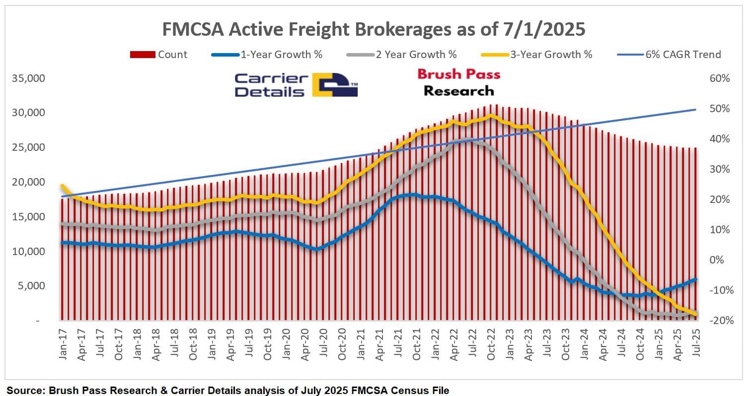 š Slight Loss in June. Data posted by Kevin Hill shows net declines in freight brokerage authorities in June (13 closures). The first half of 2025 net closures were 367 compared to 1,785 in the first half of 2024.