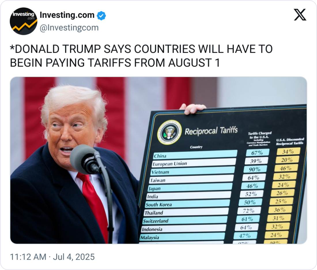 ā² Trump Extends Tariff Deadline to August 1, Raising Pressure on Trade Negotiations. The Trump administration has postponed its tariff deadline to August 1, replacing the July 9 timeline and intensifying pressure on countries still negotiating trade deals with the U.S. āIf you donāt move things along, then on August 1st, you will boomerang back to your April 2 tariff level,ā Treasury Secretary Scott Bessent said Sunday. While some officials hinted at possible flexibility, the White House plans to begin issuing tariff letters to 12ā15 countries on July 8, with rates ranging from 10% to 70%. Business leaders remain wary, especially with all the changes that have been made in this latest chapter of tariff news.