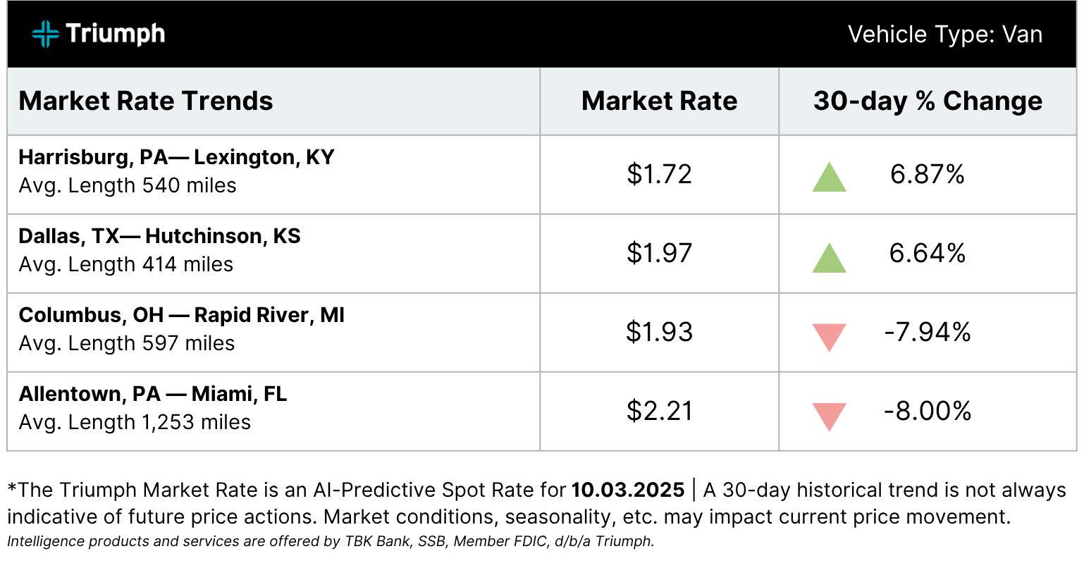 Meanwhile, reefer rates are softening at $2.30/mile (–15% YoY), creating an unusual split: cold-chain carriers have slack, while grain haulers are inching tighter. If soybeans keep piling up at home, expect that divide to close.