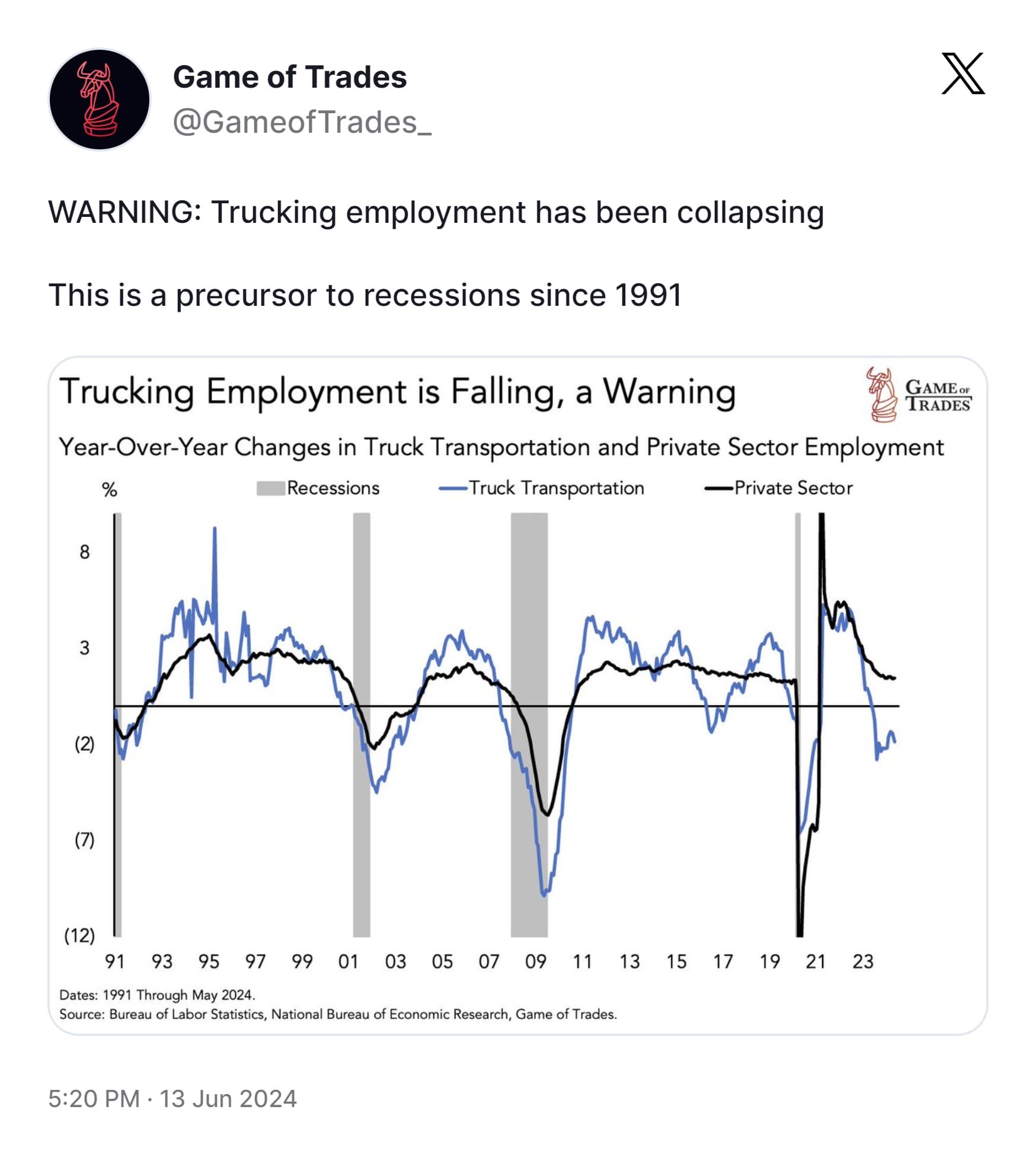 📉 Is Trucking Employment Decline a Recession Warning? A chart from Game of Trades on Twitter suggested that declines in trucking employment since 1991 have preceded economic recessions. Craig Fuller replied to the tweet and explained that the recent drop was due to an oversupply of drivers, not a shortage. He noted that employment is a lagging indicator, and the decline showed that trucking companies had stopped hiring. Fuller emphasized that it might reflect current conditions rather than future downturns.