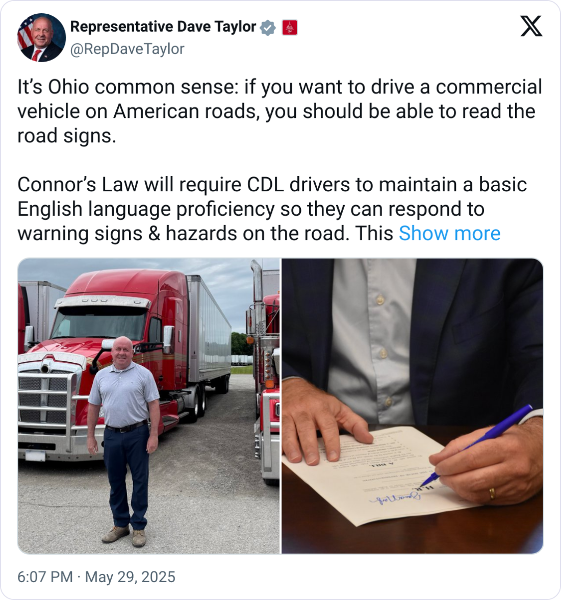 Happy Monday. Trump’s English Proficiency rule is gaining momentum. On May 29, Congress introduced Connor’s Law to cement it into law amid ongoing debate over safety and enforcement. We're covering these developments and more in today's feature.