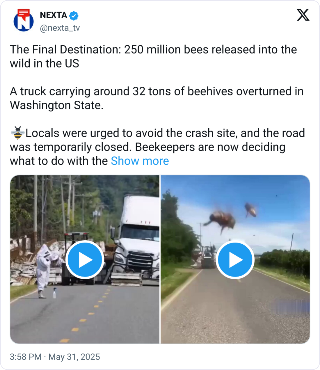 🐝 Bee Truck Overturns in Washington. A truck carrying 250 million bees (about 32 tons of hives) overturned in Washington State, temporarily closing the road and drawing swarms to the area.