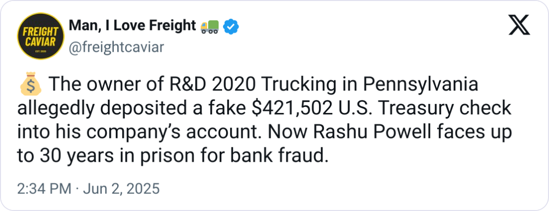 💰 Trucking Company Owner Indicted for Treasury Check Fraud. Rashu D. Powell, owner of Pennsylvania-based R&D 2020 Trucking LLC, has been indicted for allegedly depositing a counterfeit U.S. Treasury check worth $421,502.10 into his company’s account in July 2024. He faces up to 30 years in prison if convicted. The U.S. Secret Service and local police are investigating.