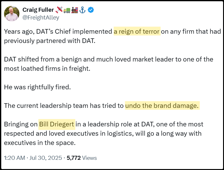 "Driegert [is] one of the most respected and loved executives in logistics," FreightWavesâ Craig Fuller posted, calling his arrival a step toward repairing DATâs brand reputation.