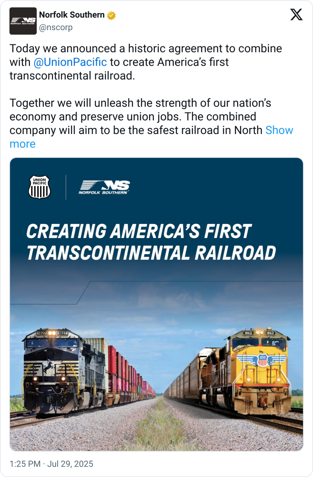 đ Union PacificâNorfolk Southern Merger and Hub Group Deal Signal Freight Consolidation. Union Pacific has officially announced an $85 billion merger with Norfolk Southern, forming the first coast-to-coast Class I railroad. The combined carrier will control 50,000 miles of track and handle nearly half of U.S. rail freight volume. âThis is a great, great merger for America,â said UP CEO Jim Vena, though labor leaders and senators warned of higher costs and reduced competition. Separately, Hub Group bought Marten Transportâs intermodal division for $51.8 million, doubling its refrigerated container fleet. Deutsche Bank analysts called the move âstrategically significant,â reflecting growing demand for temperature-controlled freight despite broader market volatility.