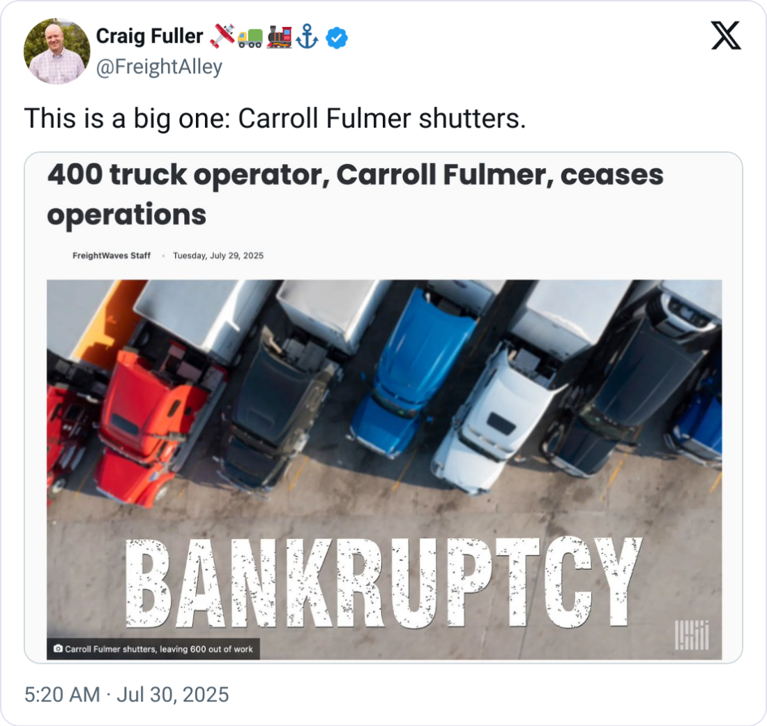 đ Carroll Fulmer Shuts Down. Carroll Fulmer Logistics, a 400-truck carrier operating since 1954, has ceased operations. The Florida-based company cited mounting financial pressures as the freight downturn continues to force closures among mid-sized fleets.