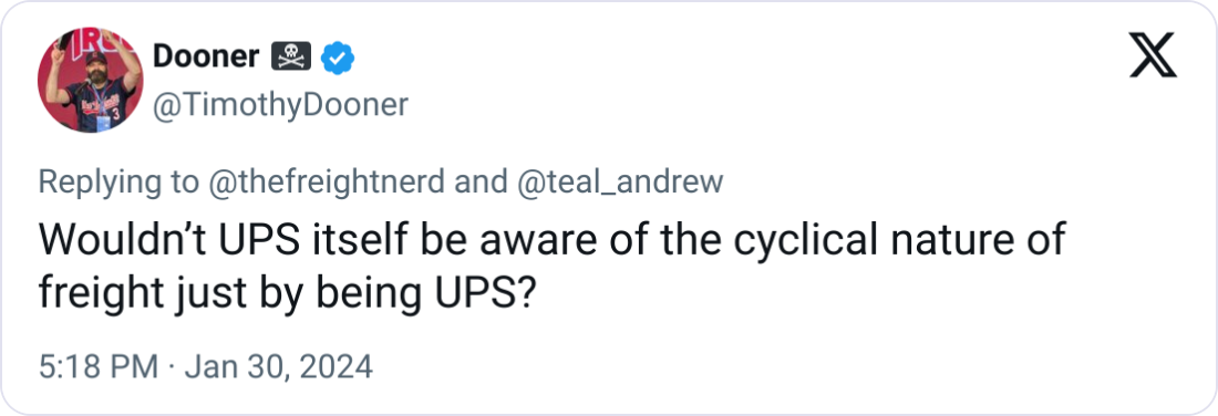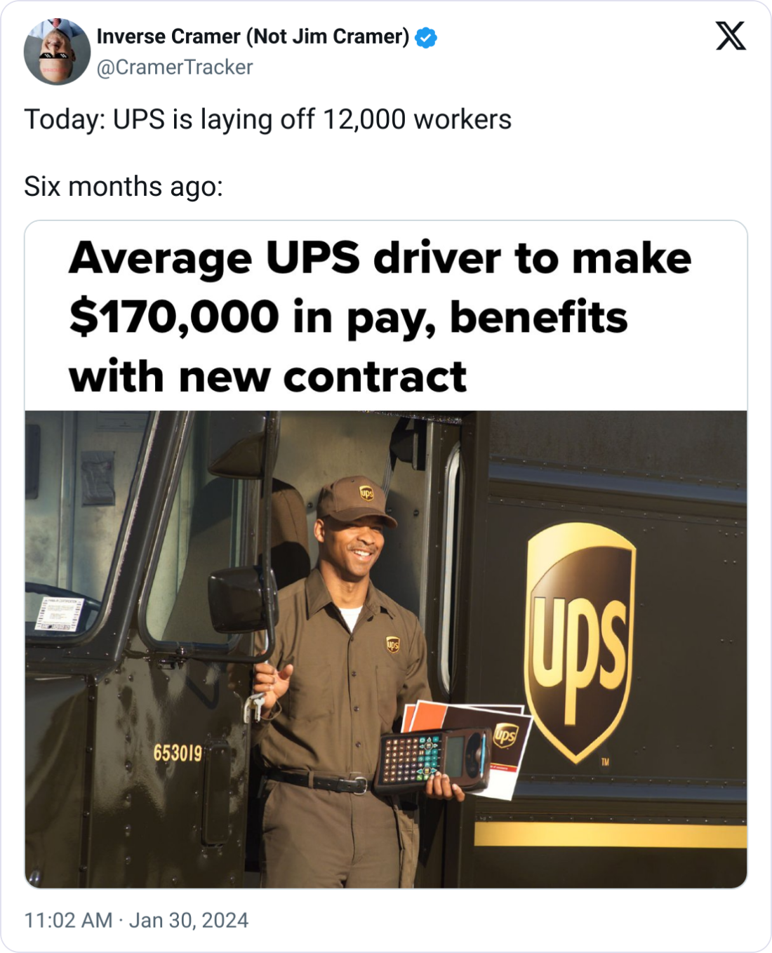 Good Monday morning. Today, we're covering UPS post-earnings report maneuvers: From 12K in job cuts to possibly selling its Coyote brokerage unit. Plus, explore truck volume trends, beefed-up cargo thefts in Philly, and the sustained strength of U.S. cross-border freight. The world's most famous double broker is also back.
