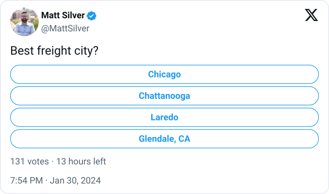 🤔 Best Freight City? Matt Silver, the CEO & Co-Founder of Cargado, is asking his X audience to vote on the best freight city in the US. We think it's Chicago. What about you? Comment on his tweet if you believe it is a city not listed.
