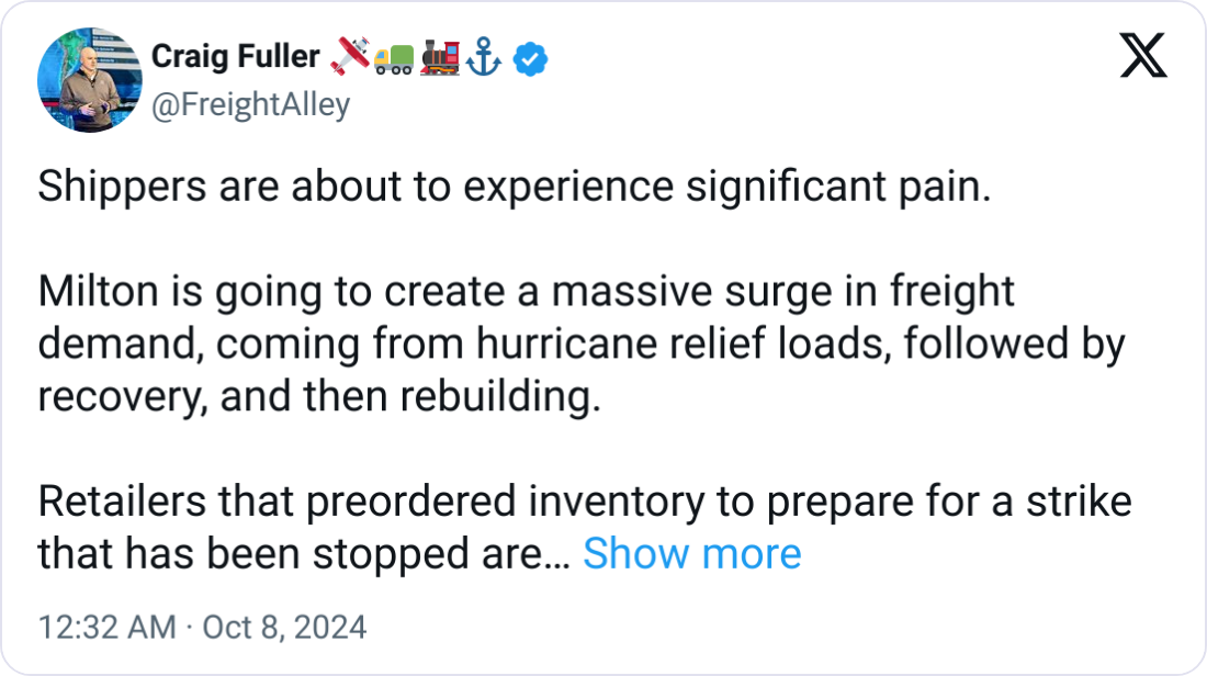 Good morning. Hurricane Milton could be the most destructive hurricane to Florida in the last 100 years. Here's what you need to know about its strength, path, and potential impact on the supply chain.
