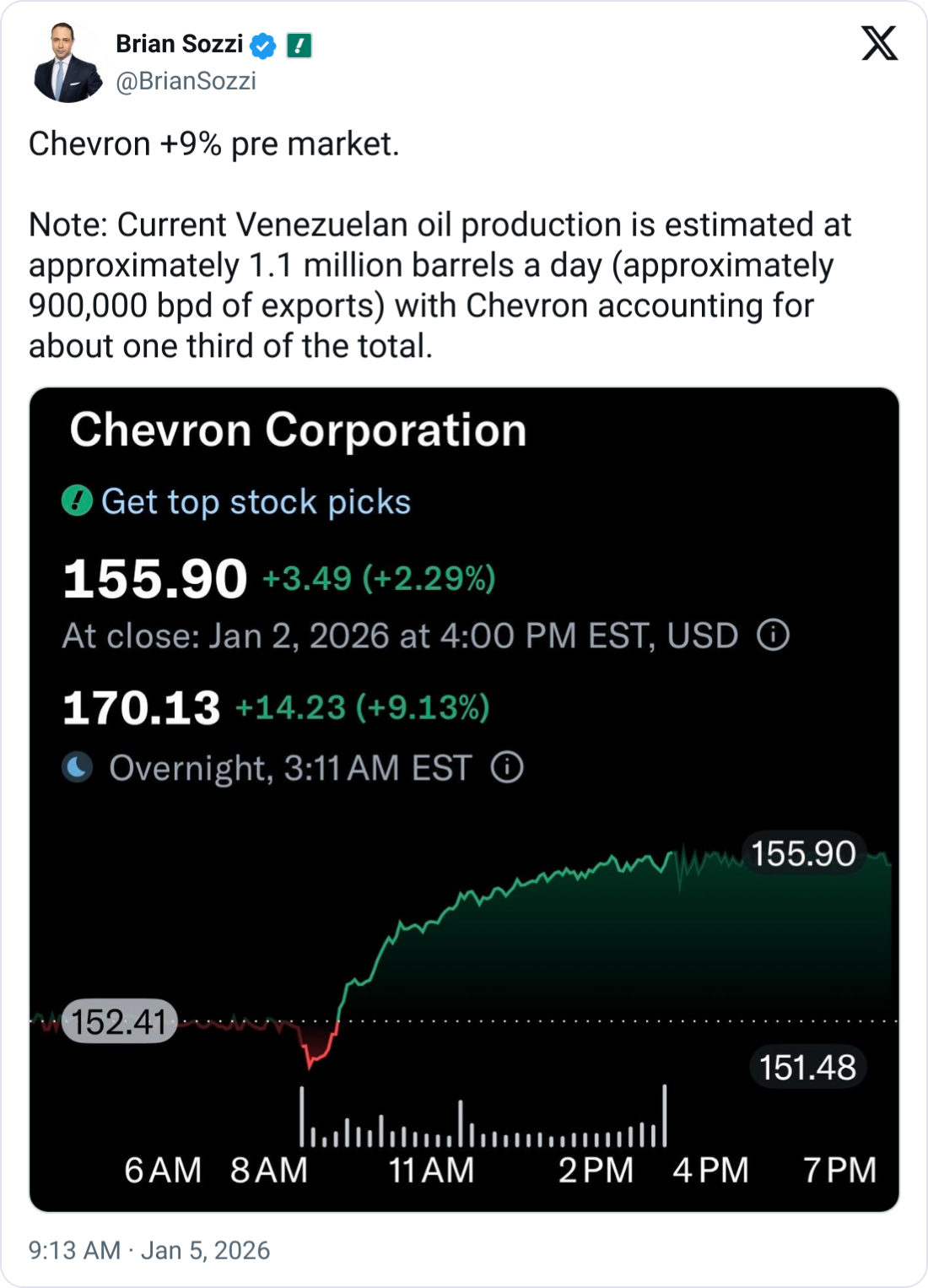 Chevron accounts for roughly one-third of Venezuela’s current output, making it the most direct U.S. corporate exposure to any future reopening.