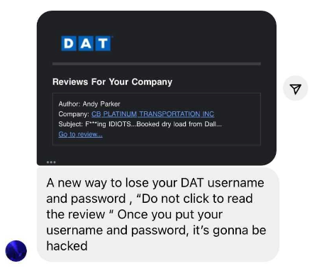 We've received a screenshot of a DAT phishing email where the DAT user received what looked like an email from DAT stating that a negative review had been posted on their DAT Company page. In the email, you can click on the "Go to review" link. Once you click on that link, it redirects you to a page that looks like a DAT login page, but in reality, it is just a website set up to phish your login credentials.