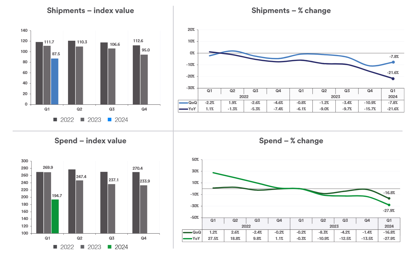 🤔 Question of the Day: In Q1 of 2024, shipment volumes dropped by __% from Q4 2023 and saw a 21.6% decline compared to Q1 2023. Find the answer in our main story.
