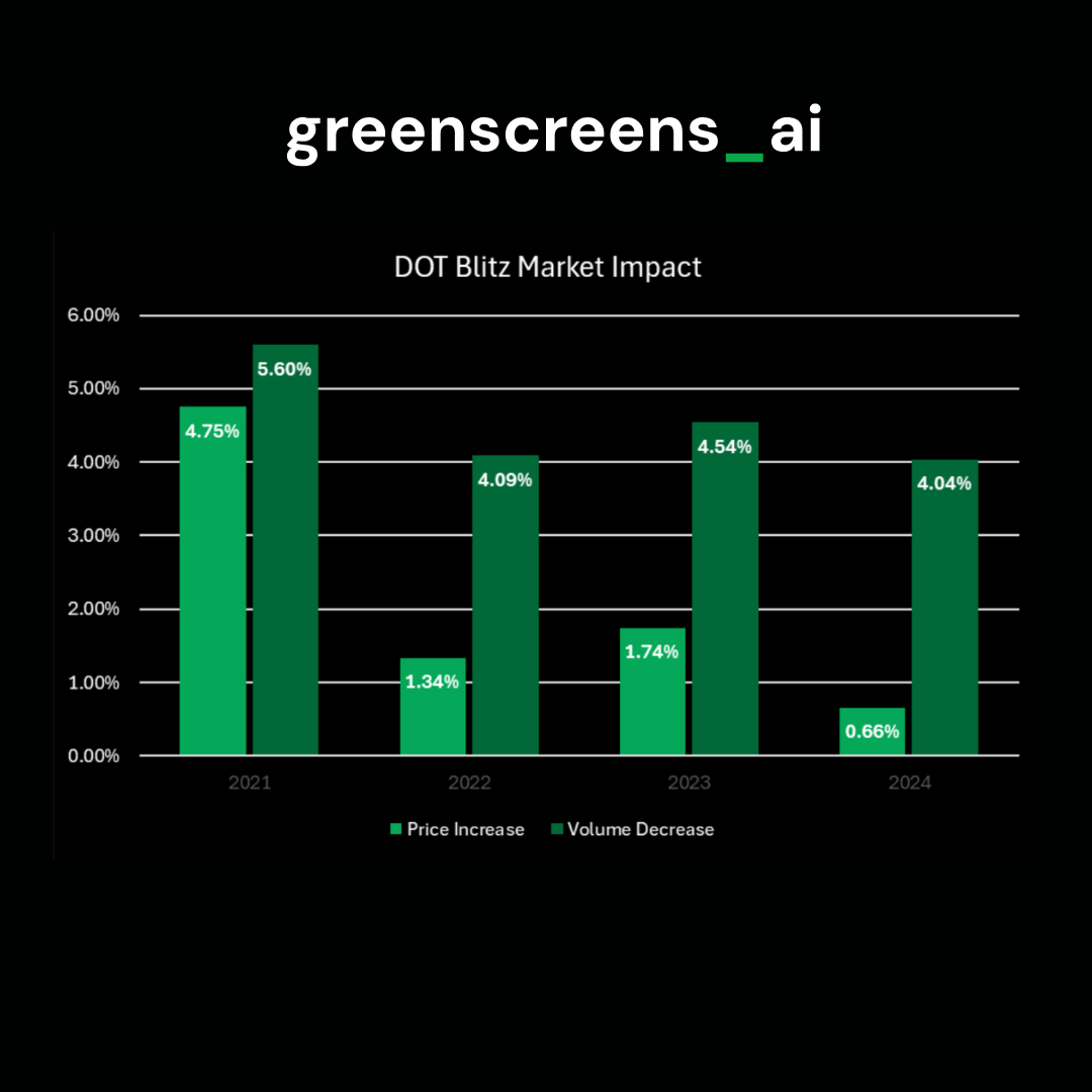 These figures matter because every truck pulled off the road tightens capacity, even if only temporarily. As Greenscreens.ai’s historical data shows, spot rates typically climb by 4-5% during Blitz Week, with freight volume taking a short-term hit of up to 5.6% in years past.