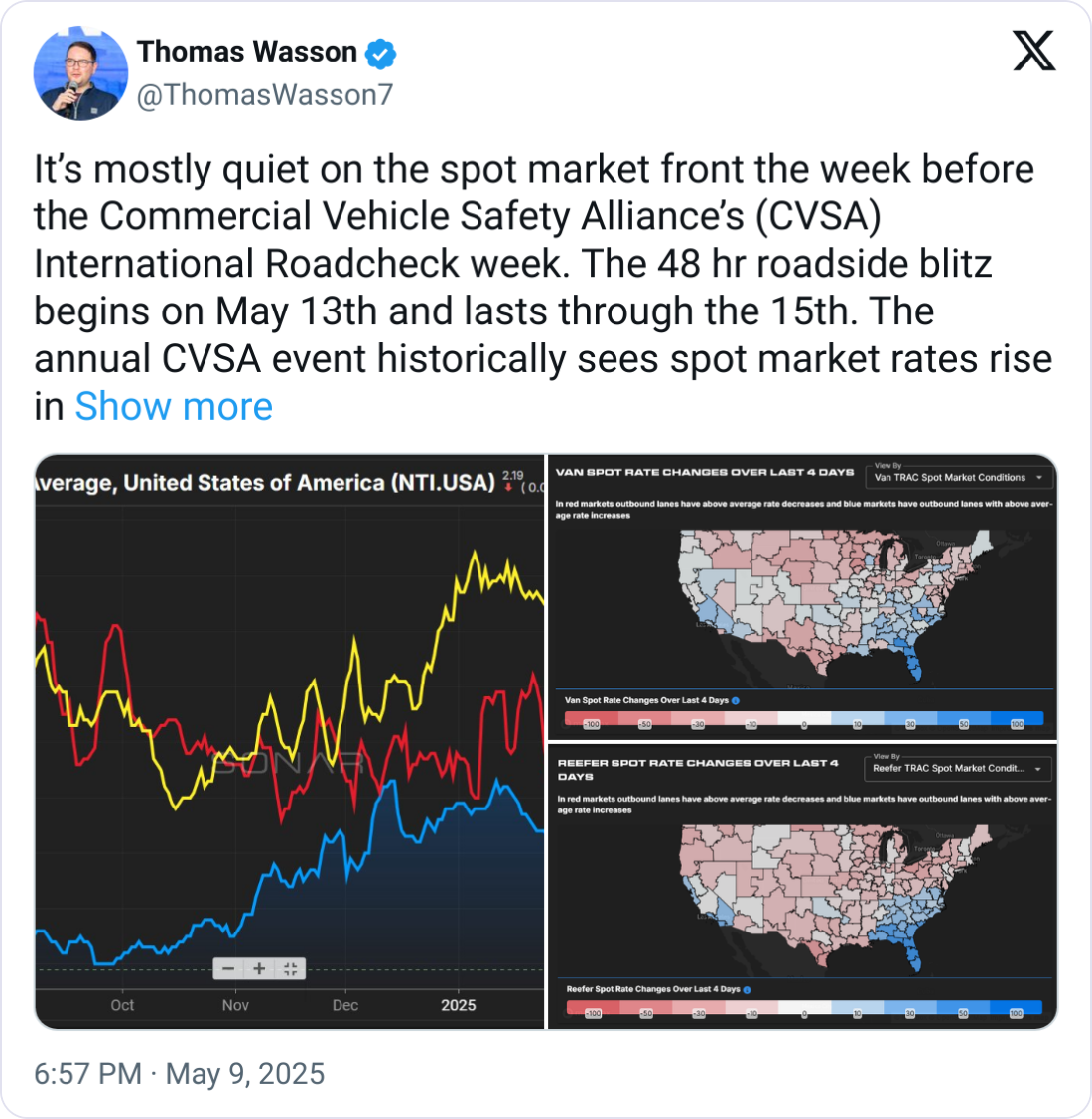 According to FreightWaves’ Thomas Wasson, dry van and flatbed spot rates actually declined last week: