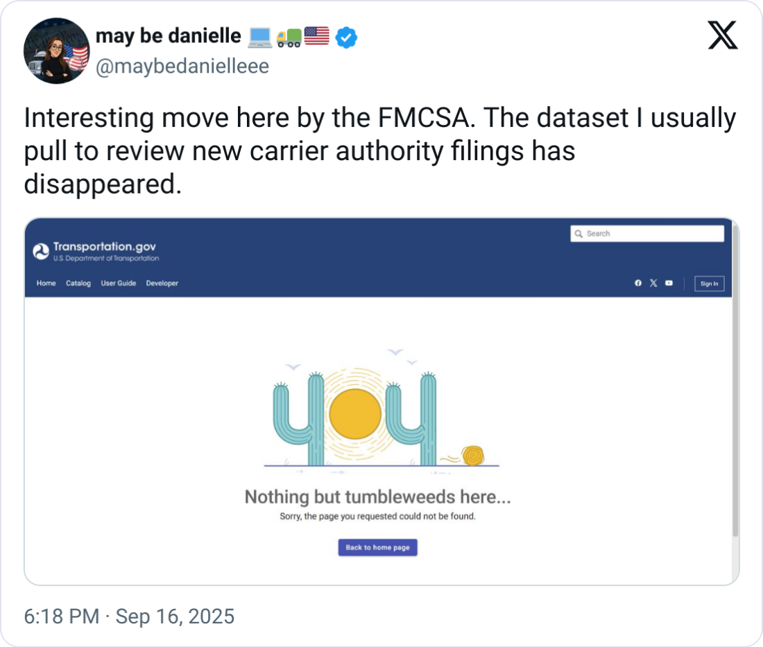 The freight world came across a major curve ball yesterday: FMCSA pulled large chunks of its daily datasets off the DOT’s public portal with no explanation.