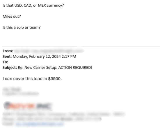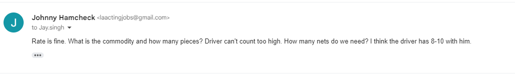 Enter "Johnny." A friend of the real broker who had time today. Using a second email address, he accepted the bogus ping-pong load from the double broker, who gave him a rate of $4200.