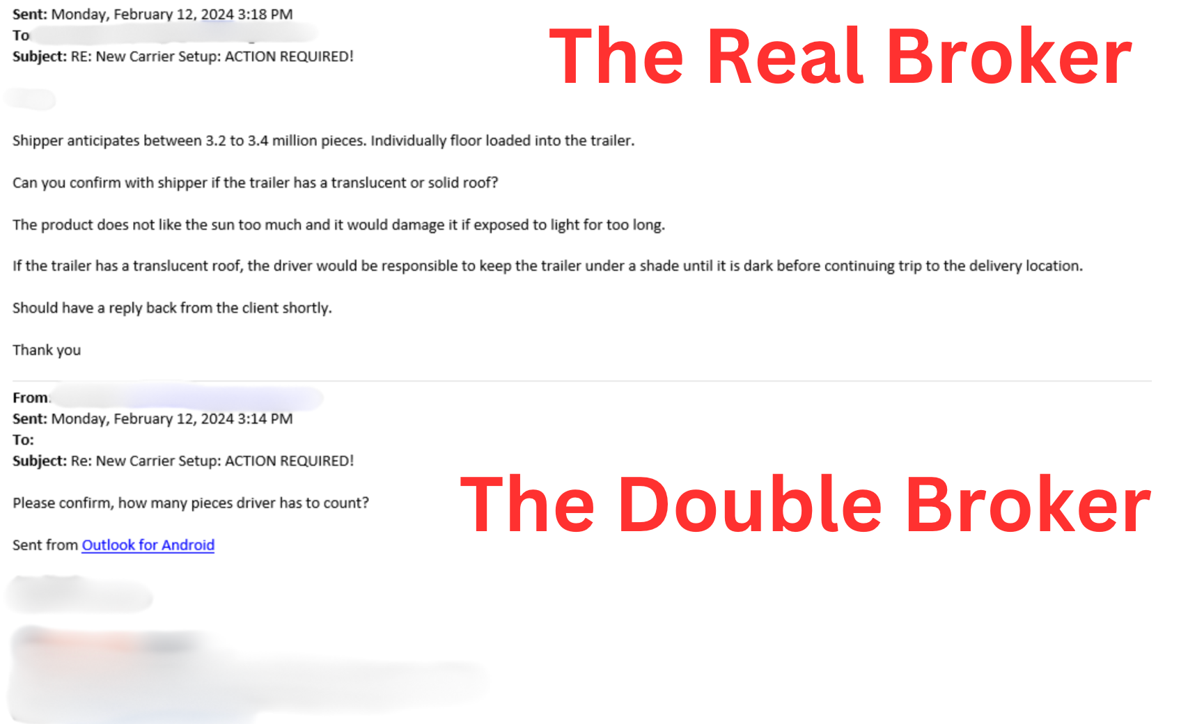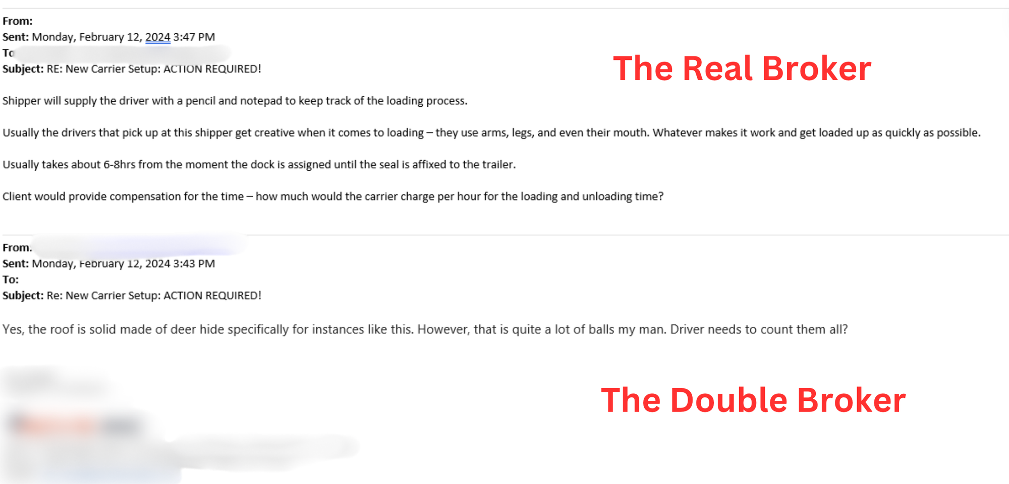 This is where things get fun. The legit broker had the double broker running back and forth with one ridiculous request and stipulation after another.