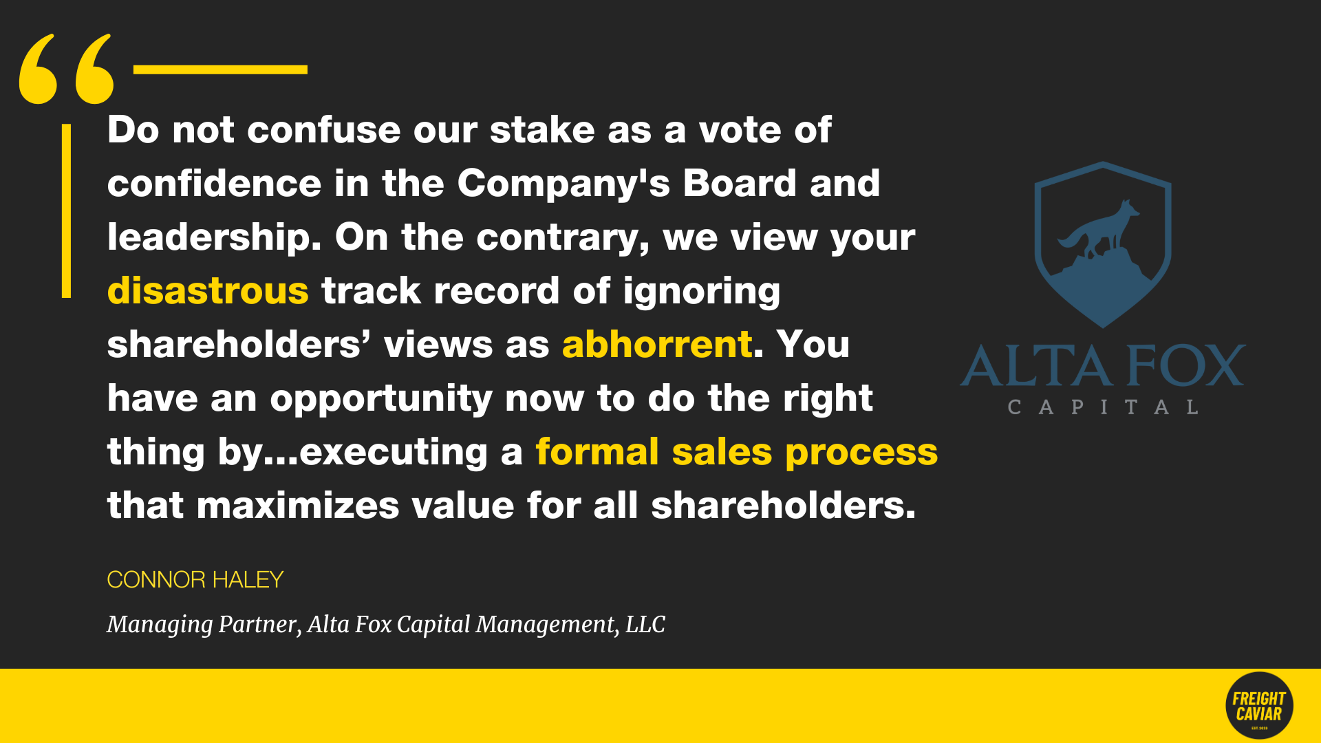 Connor Haley of Alta Fox's letter to Forward Air board members began rather strongly, reading, "We view your disastrous track record of ignoring shareholders' views as abhorrent." Ouch.