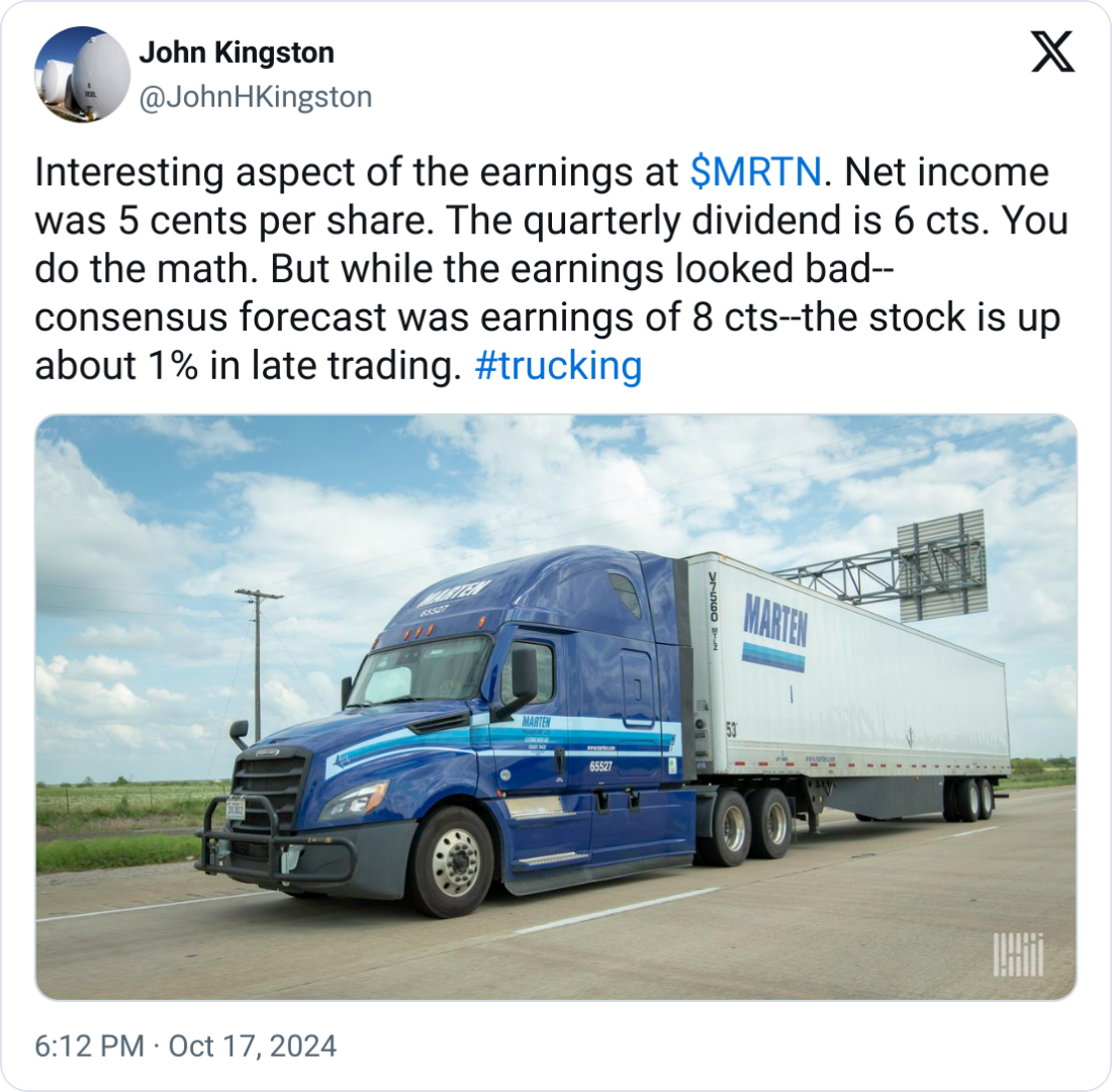 📊Marten’s Q3 Update. John Kingston shared his thoughts on Marten Transport, stating despite bad earnings (net income 5 cents a share), Marten’s stocks are up 1% (consensus forecast of 8 cents).