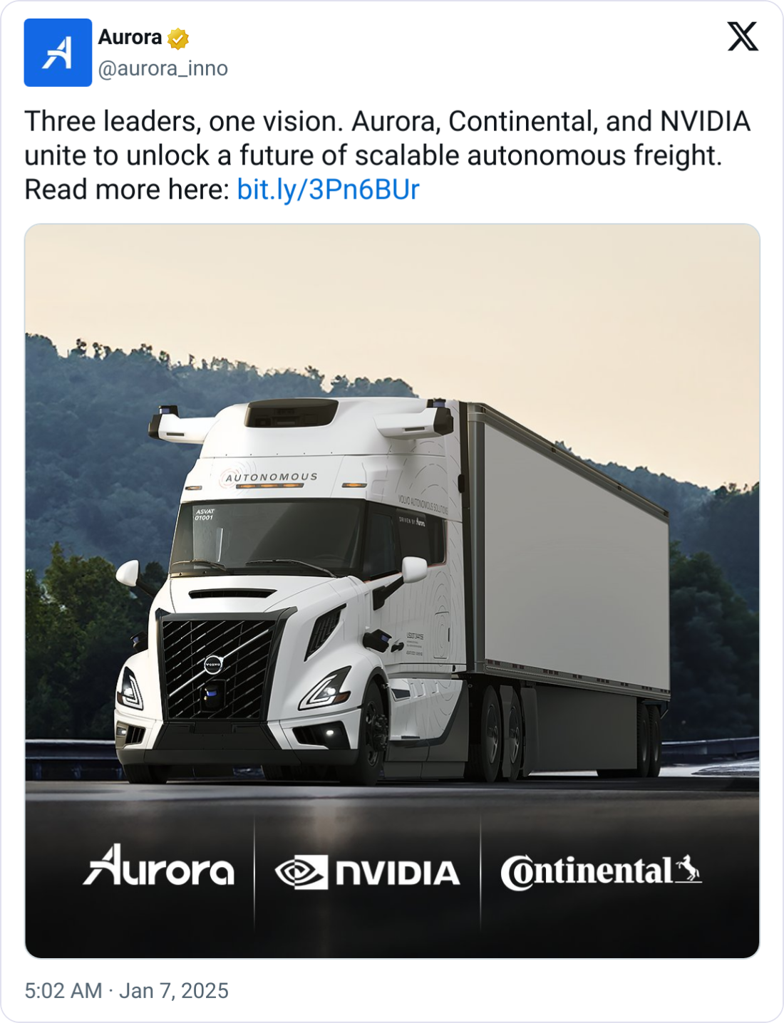 Happy Hump Day. Aurora’s new partnership with Nvidia and Continental could be a game-changer for autonomous trucking, aiming to bring driverless trucks to market by 2027. More on this bold move in today's feature.