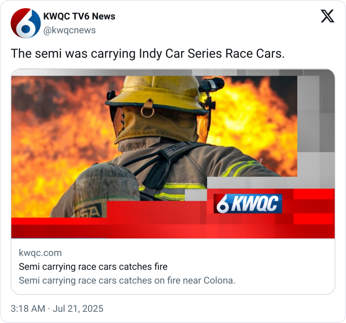 🔥 IndyCar Hauler Fire. Last Sunday, a truck transporting IndyCar Series race cars caught fire on I-75 in Colona, IL. No injuries were reported. Hazmat units were able to contain the fire and the on-board fuel containers were not damaged, preventing further escalation.