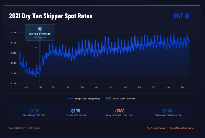 Data from DAT Freight & Analytics, analyzed by Ken Adamo, General Manager and Chief of Analytics, shows spot rates surged immediately after Uri and stayed elevated well beyond the blackout period.