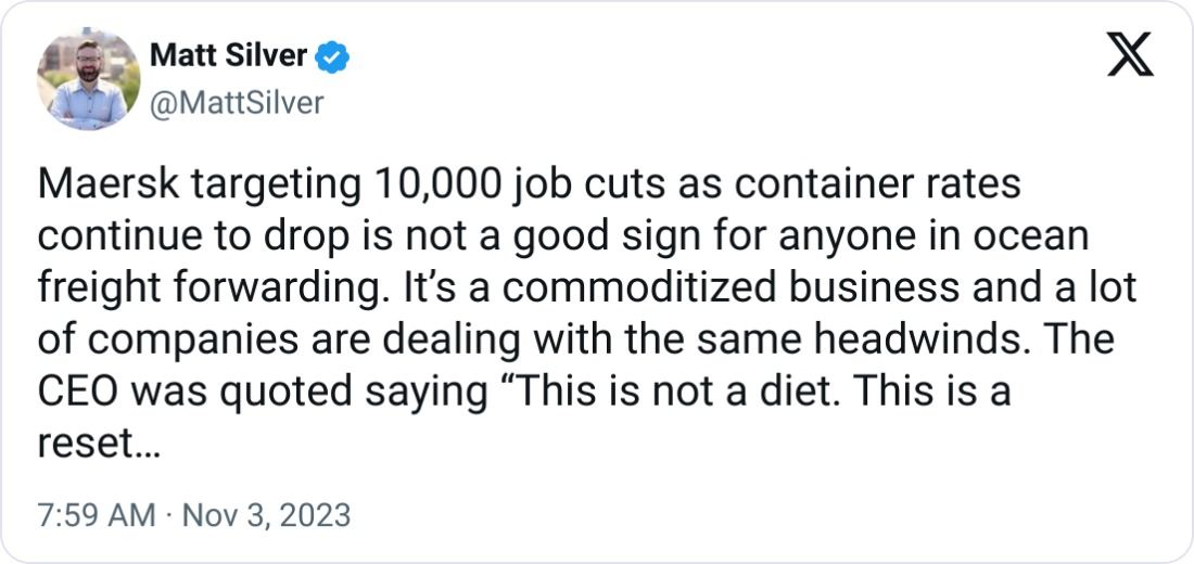 🚢 Maersk to Slash 10,000 Jobs Amid Global Trade Turbulence. In response to a dramatic drop in freight rates and a shift in consumer spending, shipping titan Maersk is cutting 10,000 jobs. Profits plummeted from a high of $8.88 billion to $521 million, underscoring a severe industry downturn. The move is part of a larger strategic reset, as the company braces for continued market volatility and a potential overcapacity crisis that could extend into 2025. This restructuring aims to save Maersk $600 million amidst a challenging future for global trade logistics.