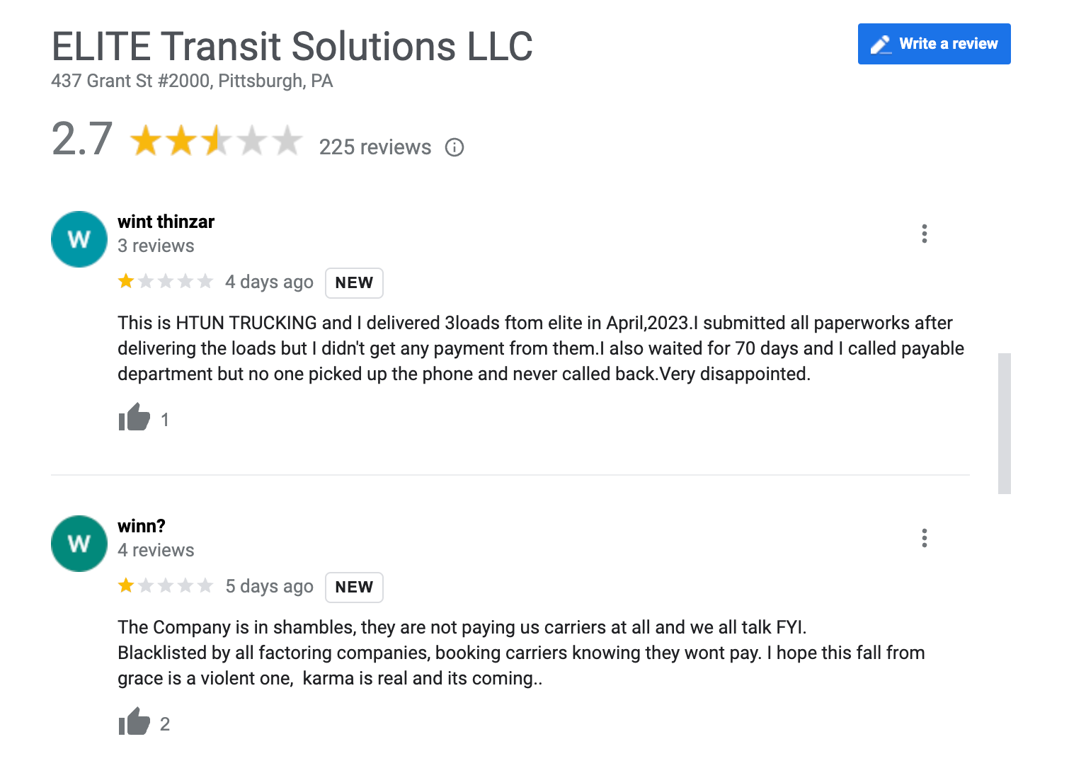 Recently, most of their Google reviews have been one-star ratings from many trucking company owners frustrated with non-payment.