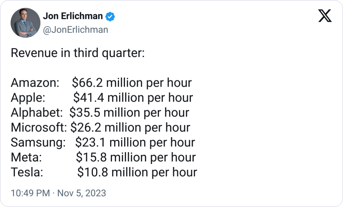 💸 Tech Giants' Earnings Power. Jon Erlichman highlights the staggering hourly revenue of leading tech companies like Amazon and Apple, with Amazon earning $66.2 million per hour.