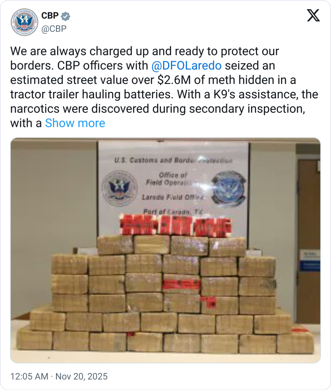 🔋 Battery Meth. Authorities found $2.6 million worth of meth hidden inside a commercial truck’s load of batteries during an inspection, seizing the cargo and detaining the driver.