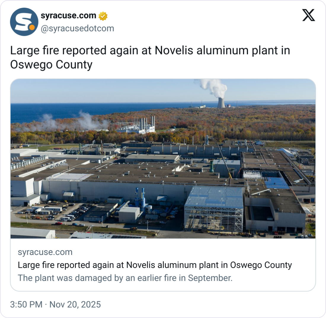 🔥 Novelis Fire Raises Fresh Concerns for Ford’s Restart Timeline. A second fire at the Novelis plant has created new uncertainty for Ford just as the automaker was preparing for production to resume. Novelis declined to say whether the latest incident will affect its restart schedule, leaving suppliers and OEMs waiting for clarity. Ford said on Nov. 20 that it is “working with Novelis to learn more” and is still assessing the operational impact. The timing is significant: one day earlier, CFO Sherry House told investors the restart was “on track” for Thanksgiving or early December. With another setback now in play, Ford shares fell nearly 4% midday Tuesday as concerns over material flow and production timing resurfaced.
