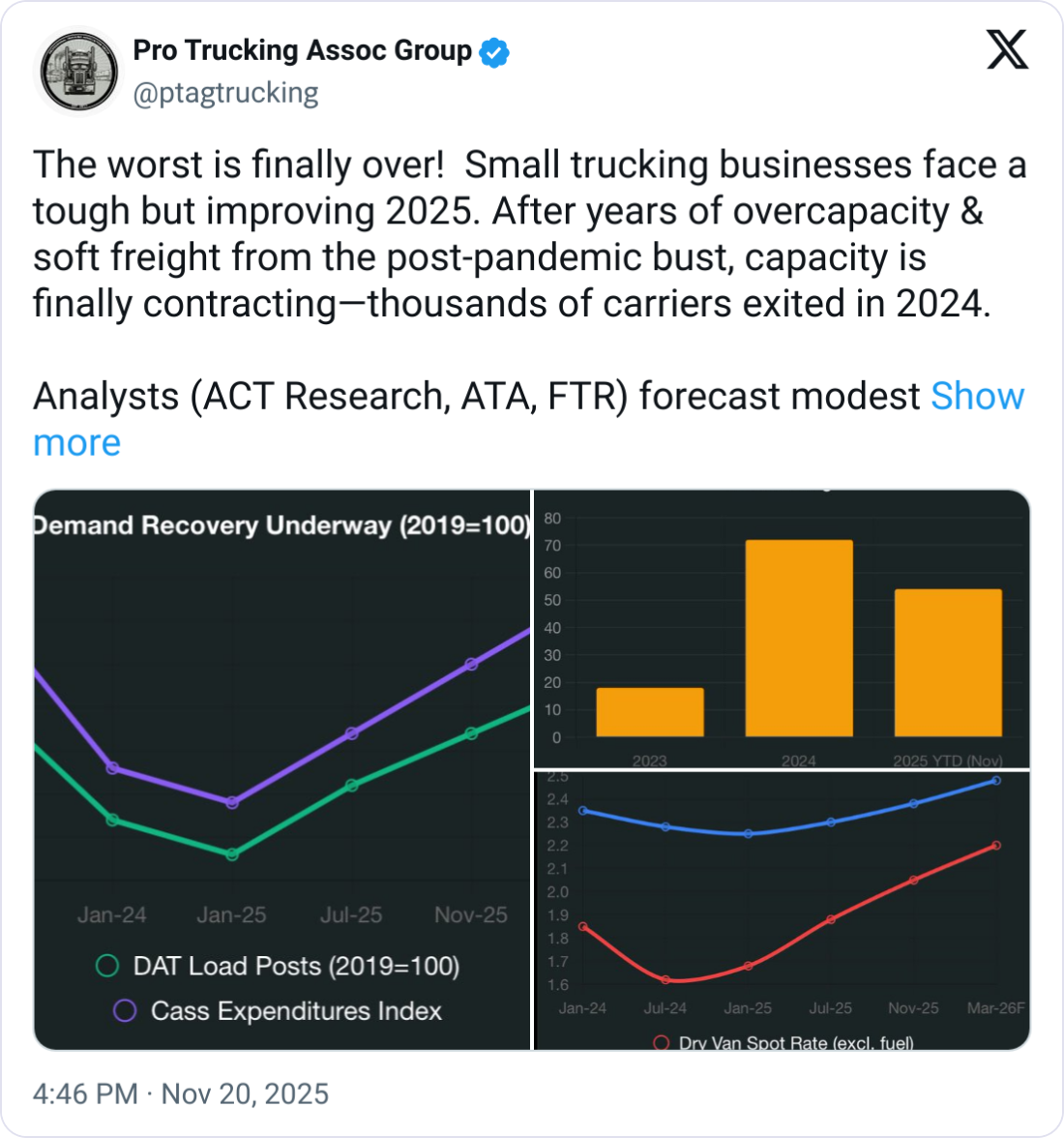 ACT Research, DAT, and Freight Transportation Research expect 2025 to deliver a modest recovery: roughly 2% GDP growth, stabilizing or rising contract rates, and slightly stronger tonnage. Capacity is finally contracting after two years of exits, and private fleets are slowing their insourcing efforts.