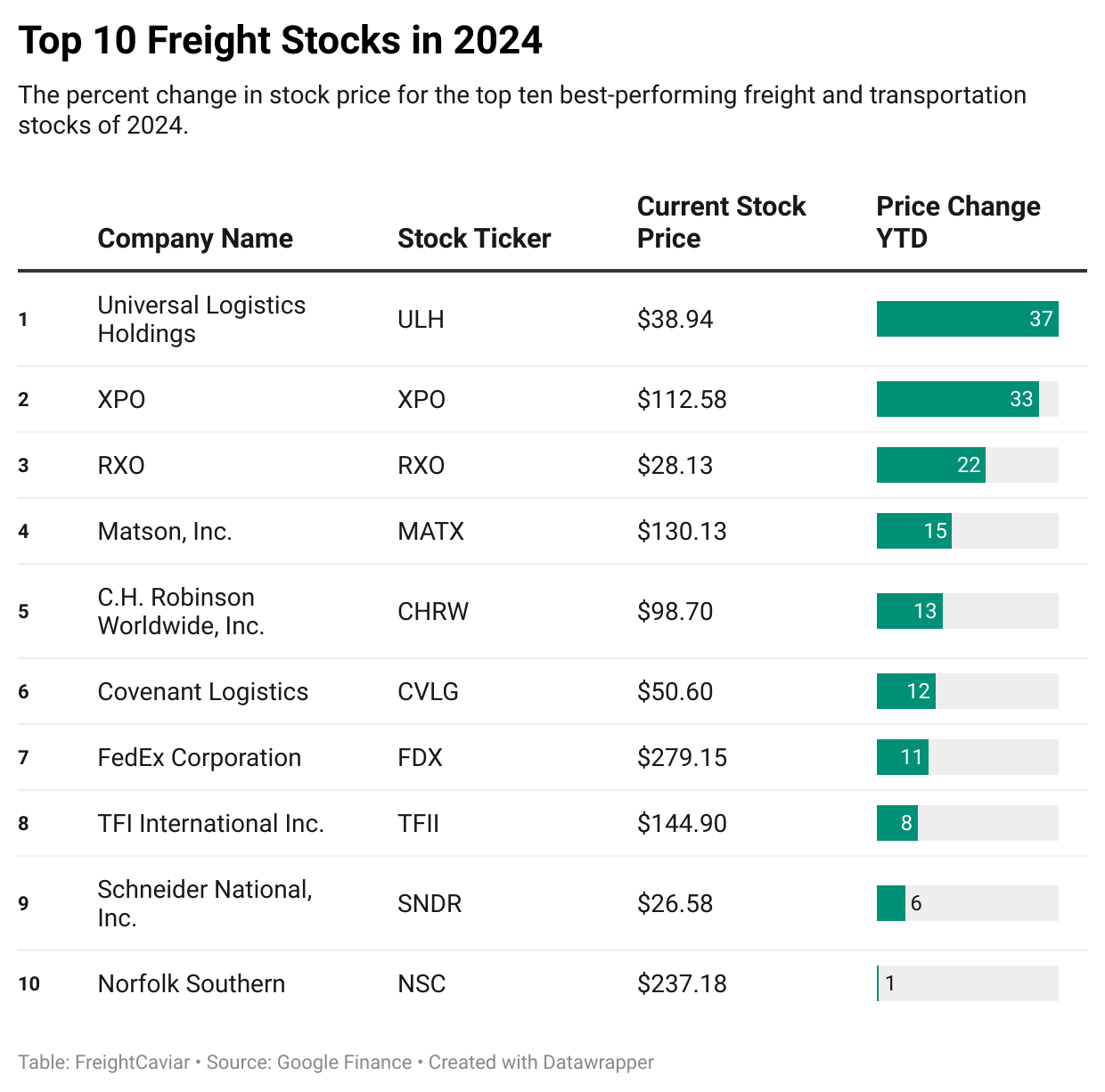 This time last year, we published a similar article on the top freight stocks, and there was a lot more to celebrate back then. Bigger gains and a few different names at the top. You check it out by clicking below. 👇