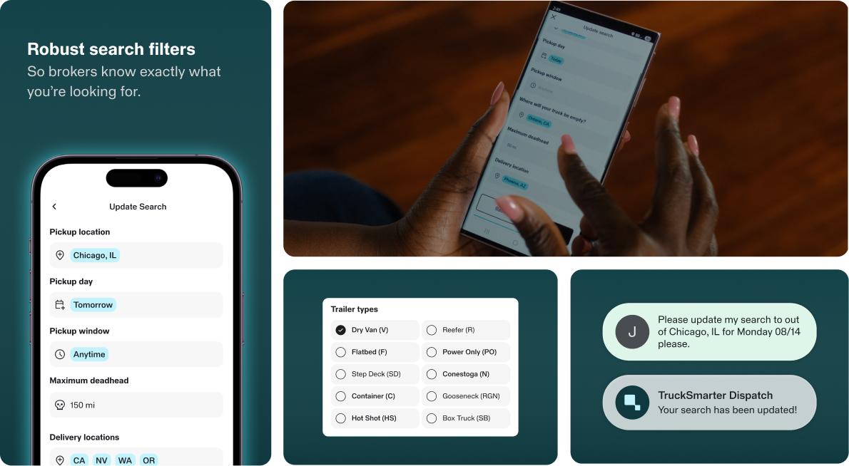 Dispatch is an AI-powered assistant built for carriers sitting on top of the TruckSmarter platform to do the grunt work drivers and dispatchers know too well. Here’s what Dispatch does to take the grind out of booking: