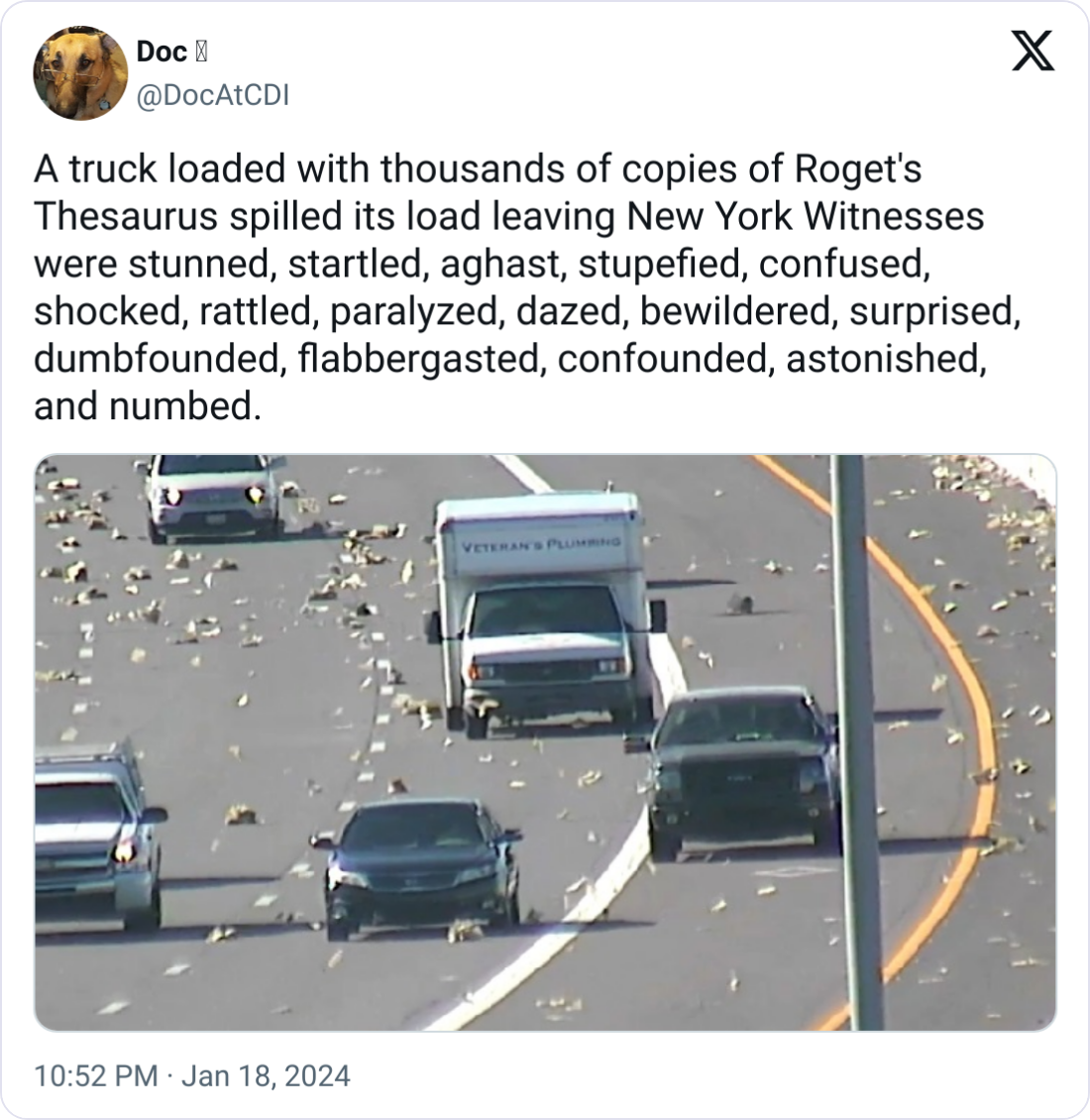 📚 Thesaurus Spill. A truck spill in New York caused a lexical explosion, with thousands of Roget's Thesauruses covering the streets, leaving witnesses overwhelmed with words.