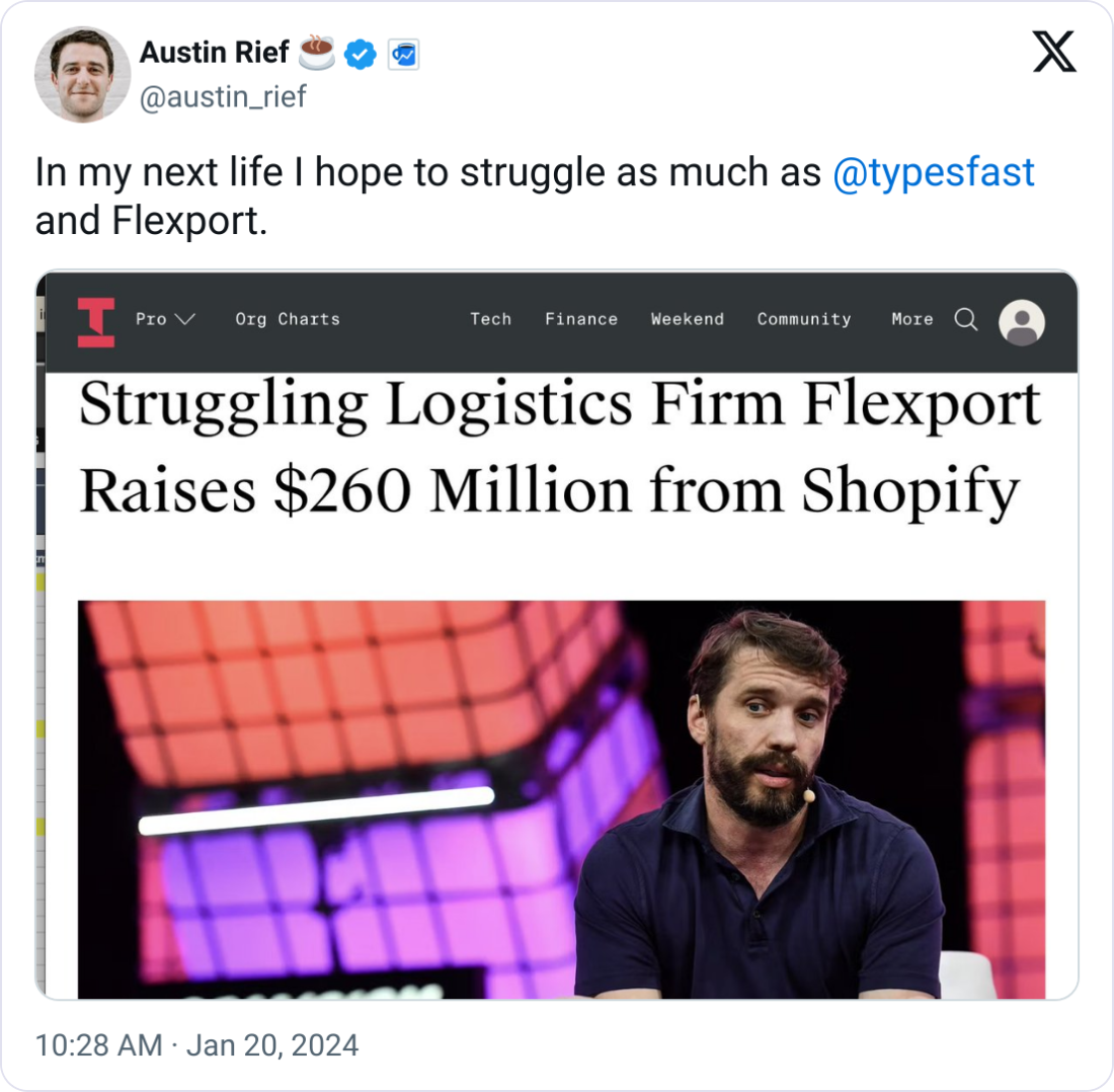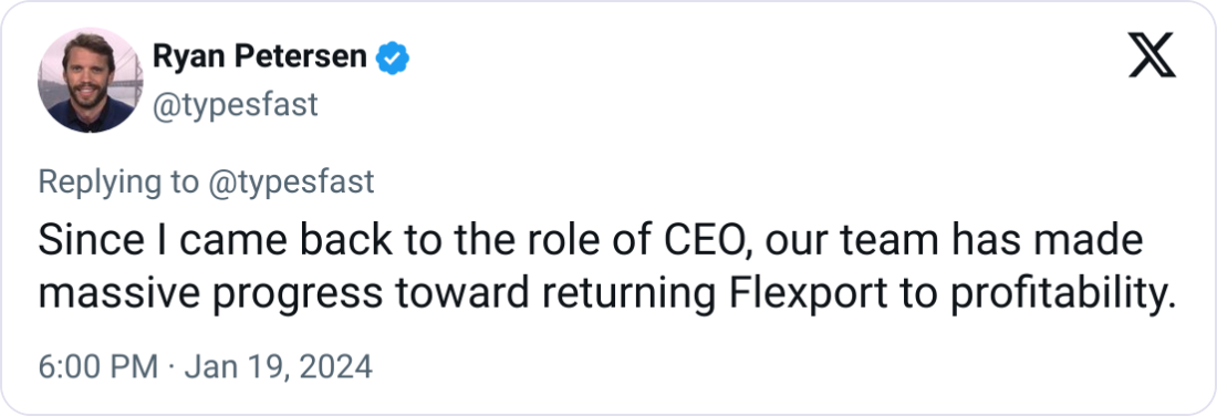 "I've stated from the beginning that Flexport is an incredibly limited company. You read it here first: If Flexport can't retain their talent, or raise much needed capital, the company will go out of business in 12 to 18 months. Yes, Flexport claims to have $1B cash in the bank. That will run out faster than people think. Ryan Petersen is about to face a Sisyphean task to keep Flexport operating. I don’t see how Flexport can survive unless they’re acquired." - Brittain Ladd, Supply Chain Expert
