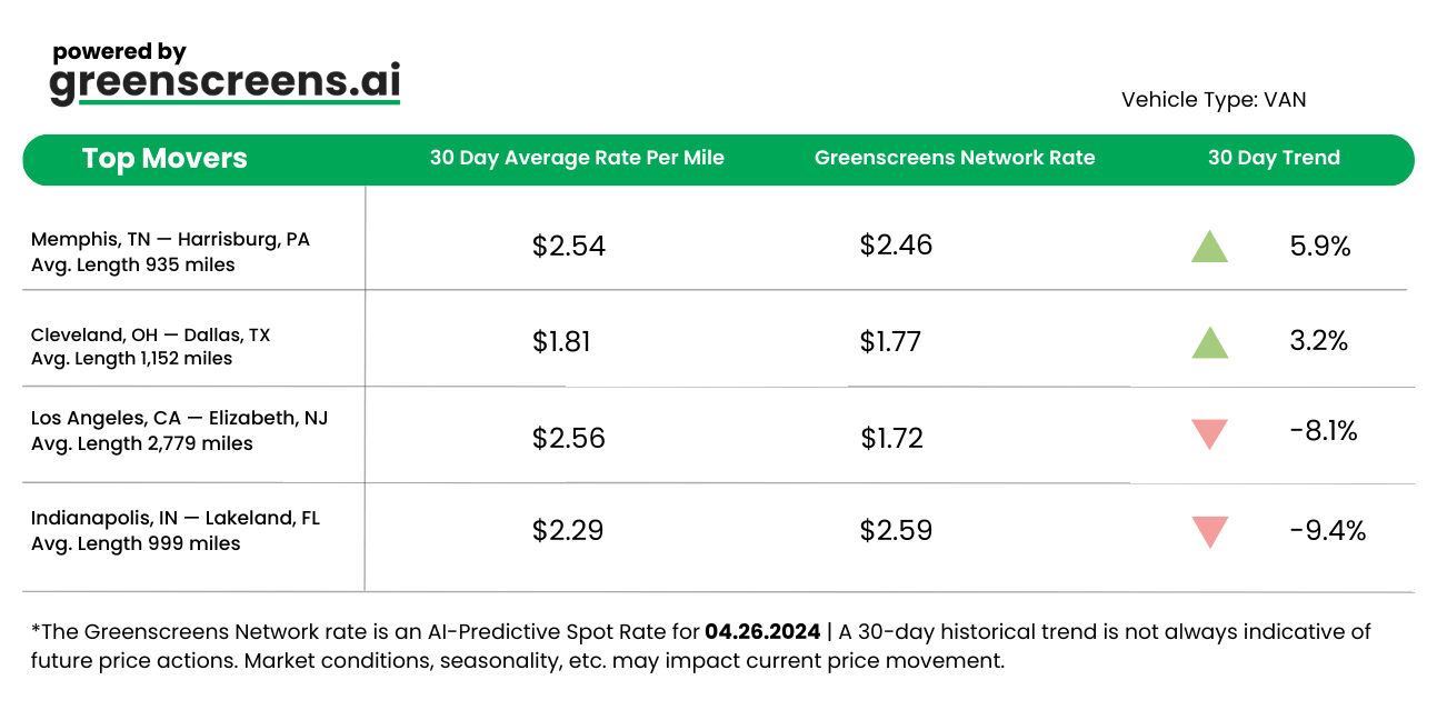 *Greenscreens.ai, forecasts real-time truckload buy prices that are suited to each freight brokerage's purchasing power using AI and machine learning. Its engine takes into account over 130 attributes and data points in each rate forecast.