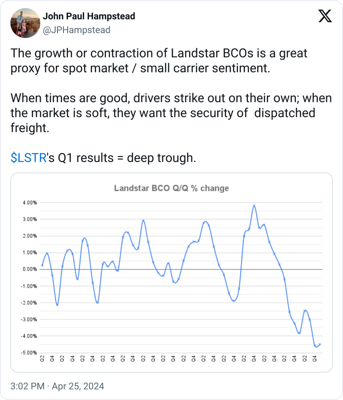 📉 Market Indicator. The change in Landstar BCOs reflects broader trends in the spot market and small carrier sentiment, with Q1 showing significant downturns.