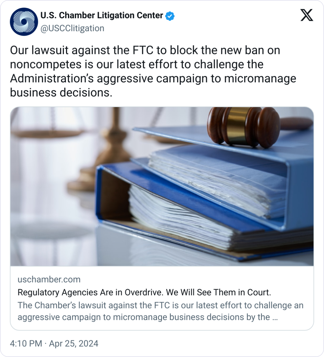 ⚔️ Non-Compete Ban Challenger Appears. The FTC has banned all non-compete clauses, freeing many in the freight and logistics sector from restrictive contracts. The U.S. Chamber of Commerce is challenging this decision, deeming it an overreach of authority and harmful to competitive business practices. They plan to take their fight to the Supreme Court. Originally, industries had 120 days to comply, but this litigation will likely delay the enactment of the ban as the case is litigated. Many argue that the Chamber is fighting a losing battle as generational attitudes regarding professional mobility and independence have shifted.