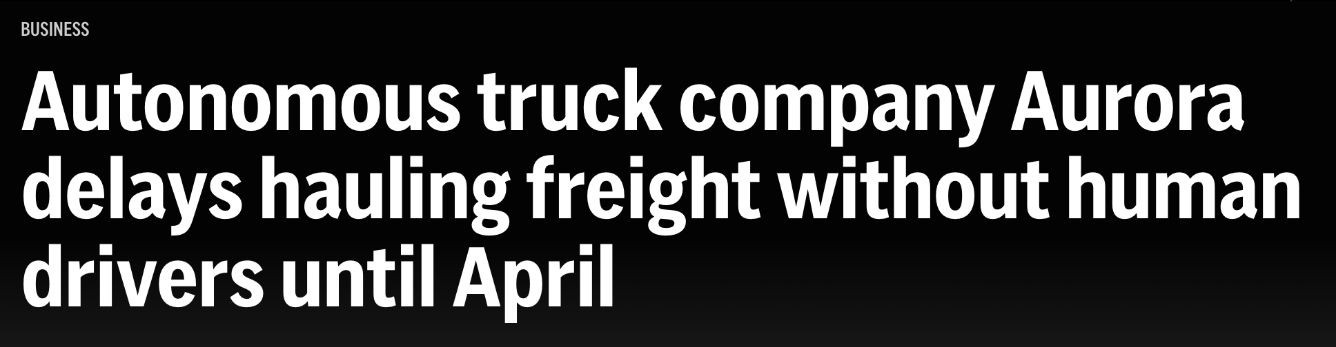 ⏰ Aurora Delays Driverless Trucking. Aurora Innovation has postponed the start of its driverless freight operations on the Dallas-to-Houston route from late 2024 to April 2025.