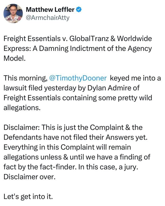 Matthew Leffler, known as the “Armchair Attorney,” weighed in on the case and its broader implications for the freight agency model:
