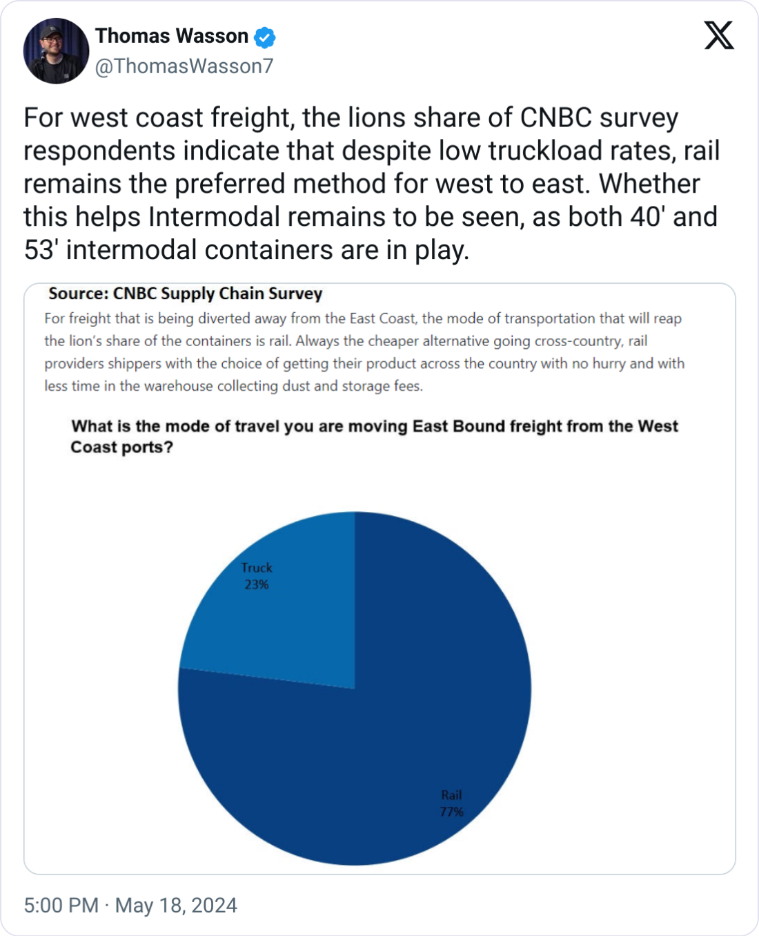 🚂 West Coast Freight Preferences. Despite lower truckload rates, 77% of CNBC survey respondents favor rail over trucking for west-to-east freight, reflecting a continued preference for intermodal transport, even as the impact on 40' and 53' containers remains uncertain.