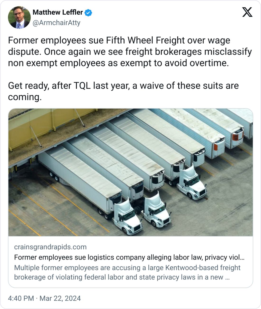 Fifth Wheel Freight, a prominent freight brokerage based in Kentwood, is staring at a lawsuit regarding labor law and privacy violation. Here's the lowdown: