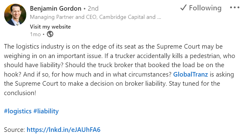 The U.S. Supreme Court's choice not to re-examine the Ying Ye vs. GlobalTranz case marks a win for the freight brokerage sector while keeping the issue of broker liability open, as it upholds the lower court rulings favoring the industry.
