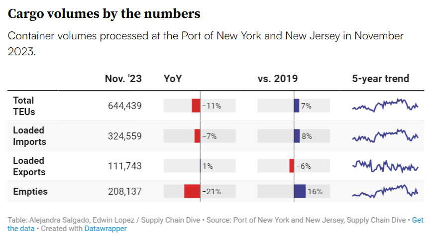 🚢 Port Numbers Plunge. The Port of New York and New Jersey saw an 11% year-on-year decline in cargo volumes for November, processing only 644,439 TEUs.