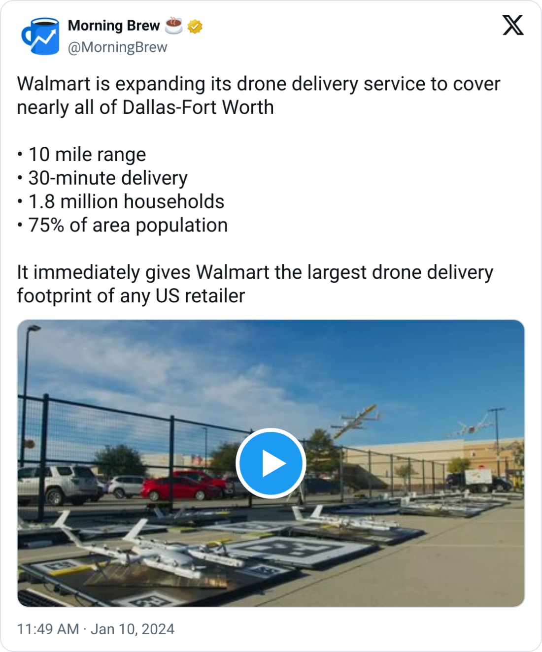 🚁 Walmart Soars with DFW Drone Delivery Expansion. Walmart has significantly expanded its drone delivery service in Dallas-Fort Worth, reaching 1.8 million additional homes. This marks the largest drone delivery initiative by a U.S. retailer. The service, facilitated by Wing and Zipline, uses advanced drones approved for Beyond Visual Line of Sight operations. Customers can receive a wide range of products, including groceries and health items, in as little as 10 minutes. Over the past two years, Walmart has completed over 20,000 drone deliveries.